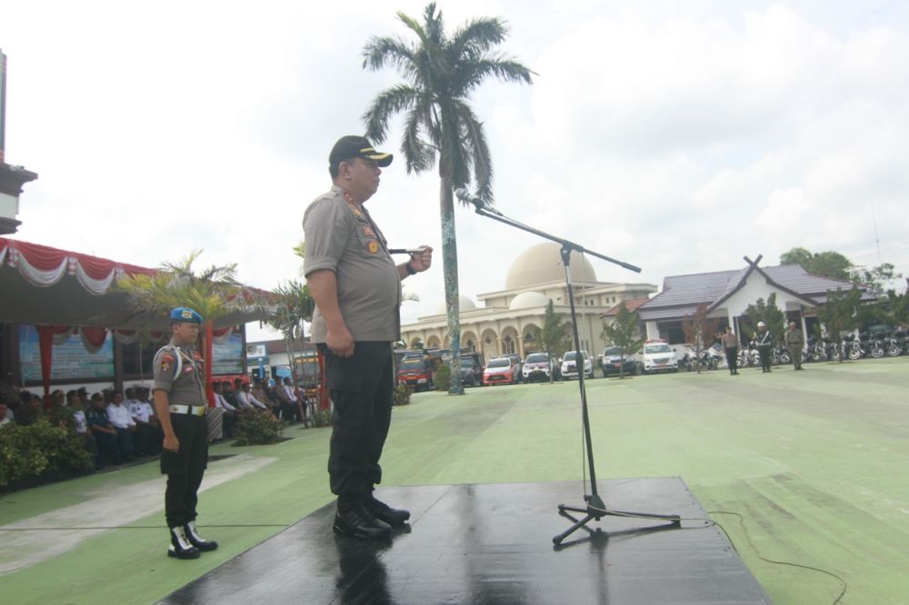 Kapolres Tanjab Barat ADG Sinaga didampingi Danramil Tungkal ilir Kapten Inf Rohandi saat membacakan sambutan Kapolri Jenderal Polisi Tito Karnapian mengatakan, apel gelar pasukan operasi kepolisian terpusat dengan nama sandi mantab brata 2018 bertujuan mengamankan penyelenggaran Pemilu 2019.