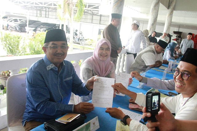 TANJABBAR – Bupati Tanjung Jabung Barat, Drs. H. Anwar Sadat, M.Ag., bersama Ketua TP-PKK Tanjab Barat, Hj. Fadhilah Sadat, S.H., memimpin aksi penyerahan zakat harta dan penghasilan melalui Badan Amil Zakat Nasional (Baznas) Tanjab Barat. Kegiatan bertajuk "Pemerintah Kabupaten Tanjung Jabung Barat Berzakat" ini berlangsung di Rumah Dinas Jabatan Bupati, Minggu (8/3/26).