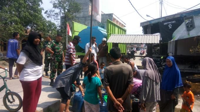 Selain pihak perusahaan AM, tampak sejumlah personil Kodim Tanjab/0419 turut membantu membagi-bagikan air ke warga.