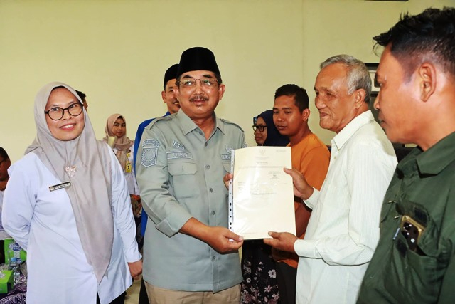 TANJAB BARAT – Bupati Tanjung Jabung Barat, Drs. H. Anwar Sadat, M.Ag., menyerahkan sebanyak 71 sertifikat tanah hasil konsolidasi kepada masyarakat Kelurahan Teluk Nilau, Kecamatan Pengabuan, dalam acara yang digelar di Aula Kantor Camat Pengabuan, Rabu (08/04).