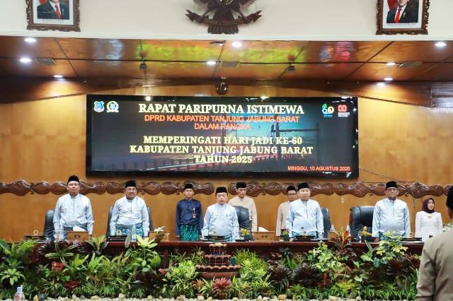 TANJABBAR - Puncak peringatan Hari Jadi Kabupaten Tanjung Jabung Barat ke-60 ditandai dengan digelarnya Rapat Paripurna Istimewa oleh DPRD Kabupaten Tanjung Jabung Barat, Minggu (10/8).