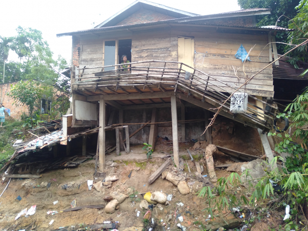 Rumah warga di bantaran sungai tersebut ambrol, karena tebing sungai longsor akibat tergerus air.