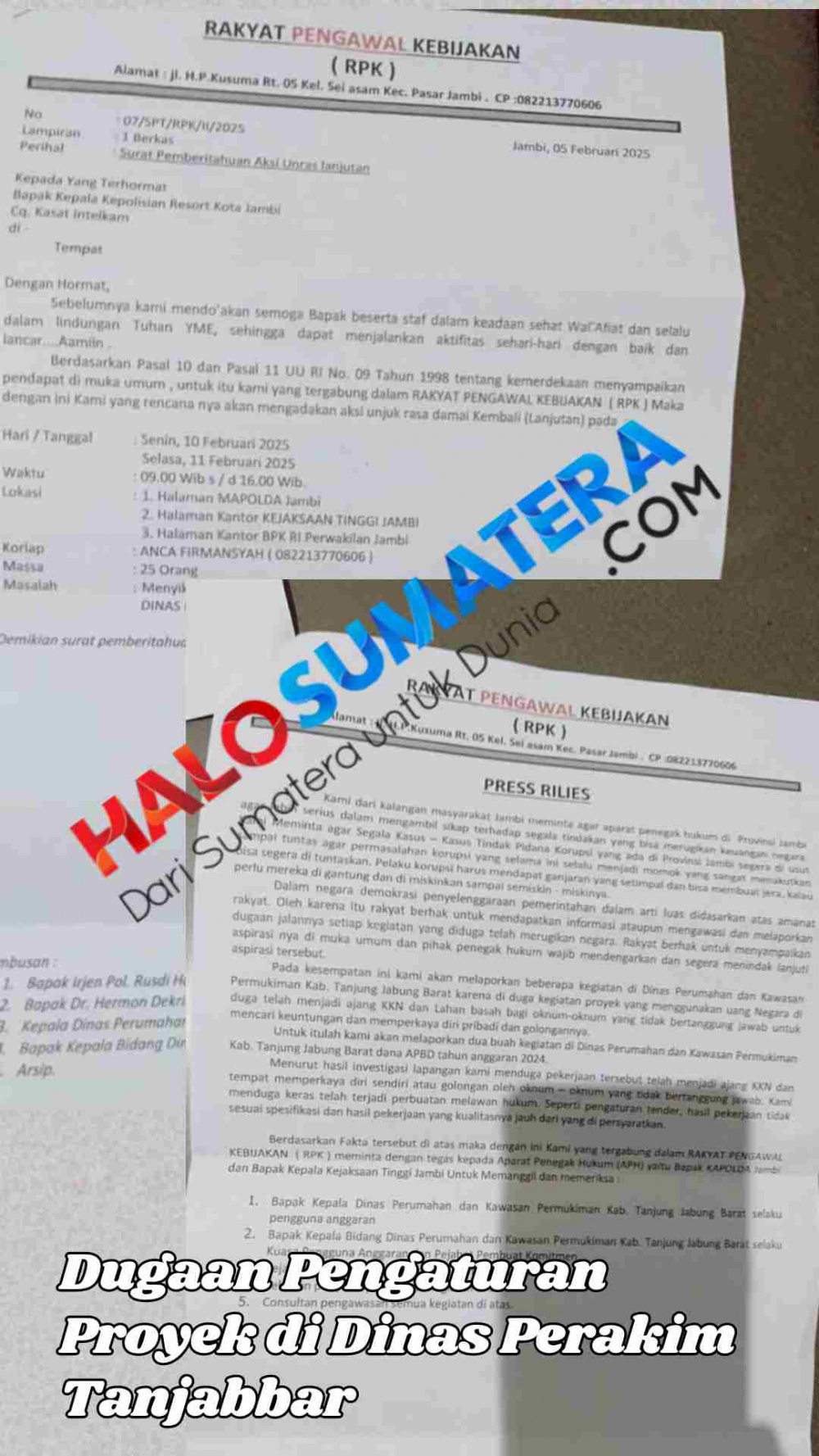Dalam pers rilis yang disampaikan dalam surat pemberitahuan ke Polresta Jambi, nomor 07/SPT/RPK/II/2025, disebutkan bahwa adanya dugaan proyek di Dinas Perakim Kabupaten Tanjab Barat dijadikan lahan basah dan ajang KKN oleh oknum untuk memperkaya diri dan mencari keuntungan pribadi dan kelompok.