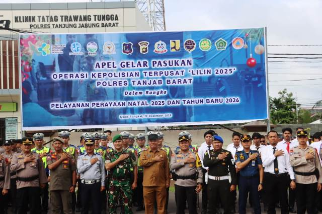 TANJABBAR – Kapolres Tanjung Jabung Barat, AKBP Agung Basuki, S.I.K., M.M., bersama Wakil Bupati Tanjab Barat, Dr. H. Katamso SA, SE., ME., memimpin langsung Apel Gelar Pasukan Operasi Lilin 2025 di Lapangan Mapolres Tanjab Barat, Jumat (19/12/2025).