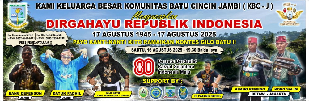 JAMBI - Menyambut peringatan Hari Ulang Tahun (HUT) ke-80 Kemerdekaan Republik Indonesia, Keluarga Besar Komunitas Batu Cincin Jambi (KBC-J) akan menggelar kontes unik bertajuk Gilo Batu. Acara ini dijadwalkan berlangsung pada Sabtu malam, 16 Agustus 2025, mulai pukul 19.30 WIB usai salat Isya, di depan Kuburan Chino Jambi.