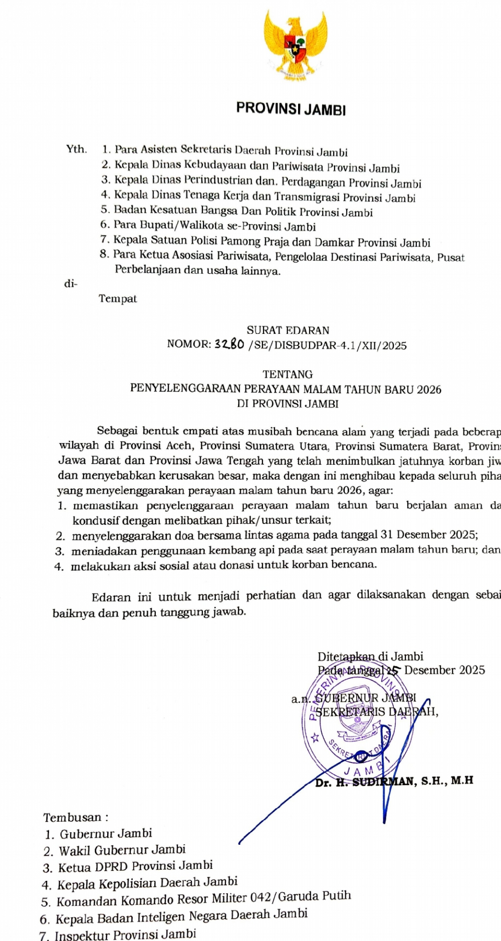 JAMBI - Pemerintah Provinsi Jambi menerbitkan Surat Edaran Nomor 3280/ SE/ DISBUDPAR - r.1/ XII/2025 tentang Penyelenggaraan Perayaan Malam Tahun Baru 2026 di Provinsi Jambi. Surat Edaran ini diterbitkan tanggal 25 Desember 2025 yang langsung ditandatangani Sekda Provinsi Jambi, Dr. H. Sudirman, S.H., M.H.