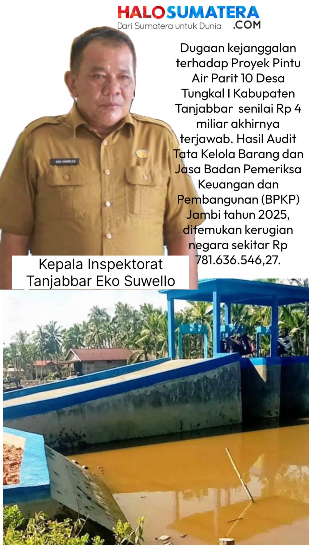 KUALATUNGKAL - Dugaan kejanggalan terhadap Proyek Pintu Air Parit 10 Desa Tungkal I Kabupaten Tanjabbar senilai Rp 4 miliar akhirnya terjawab. Hasil Audit Tata Kelola Barang dan Jasa Badan Pemeriksa Keuangan dan Pembangunan (BPKP) Jambi tahun 2025, ditemukan kerugian negara sekitar Rp 781.636.546,27.