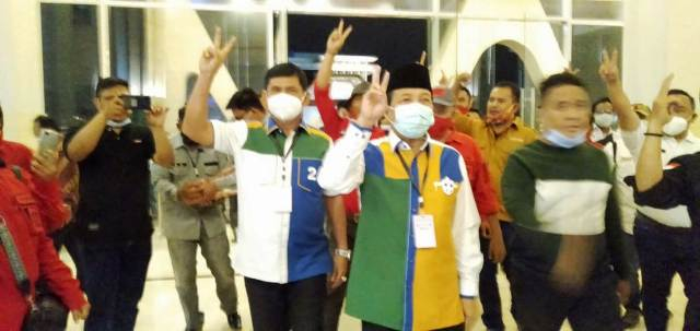 JAMBI - Calon Wakil Gubernur Jambi nomor urut 2, Syafril Nursal tiba dilokasi debat, di Swiss -Belhotel Jambi, Sabtu malam (21/11/2020).