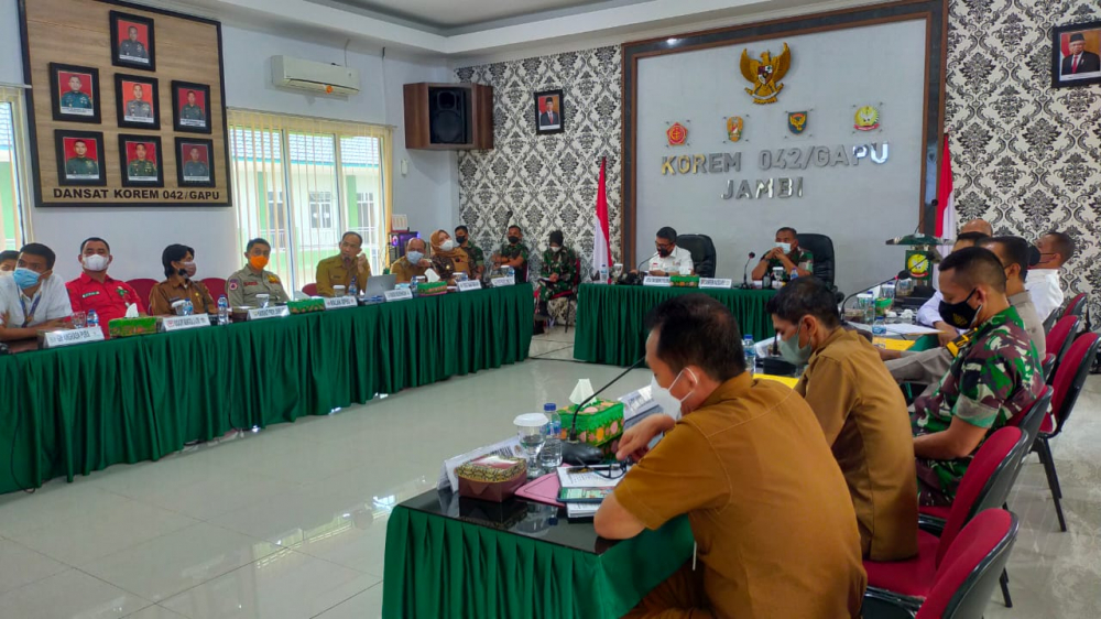 Pantauan halosumatera.com Senin siang di ruang aula rapat Makorem 042/Gapu Jambi, Lantai dua, tampak hadir dalam pertemuan tersebut Asdep Koordinator Kemampuan dan Kerjasama Pertahanan Brigjen TNI Suparjo, Asdep Koordinator Doktrin dan Strategi Pertahanan Brigjen TNI Frengky E. Riupassa, Kabid Kerjasama Pertahanan Kol. Inf. Kartika Adi Putranta, Analis Politik, Hukum dan Keamanan Domael Putra.